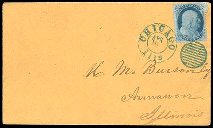 "Grid" of Chicago, Ills. Superb strike of blue 9 bar grid and matching "Chicago, Ills Apr 10" postmark tying 1857 1¢ Blue type V, an Extremely Fine gem, a superb stamp and cover - exceptionally attractive. Scott No. 24; Estimate $150 - 200. US$150-200 (Image)