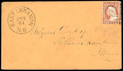 Square grid of Small Squares of East Lebanon, N.H. Bold and unusual cancel ties 1851 3¢ on cover to St, Charles, Ill, adhesive also with manuscript "CP" Postmaster initials, postmarked "East Lebanon, N,H, Jan 14" cds at left, Very Fine, quite scarce. Scott No. 11; Estimate $100 - 150. US$100-150 (Image)