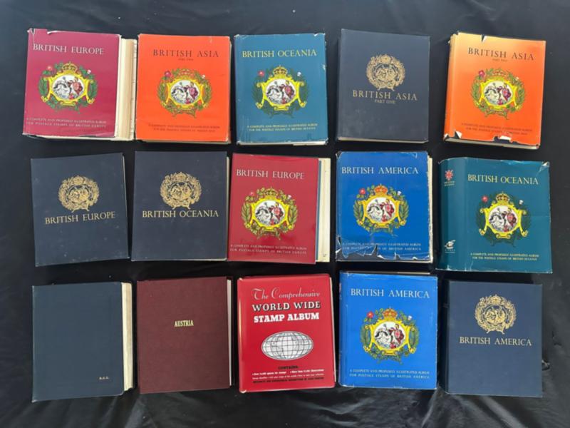 Supplies - A group of fifteen empty used albums produced by Minkus and Scott, includes British America (3), British Europe (3), British Oceania (3), N=British Asia Pt1 & Pt 2 (2), Austria (1), International Stamp Album (1) and Worldwide stamp Album (1), contained to two cartons, appears fi=-vf (Image)