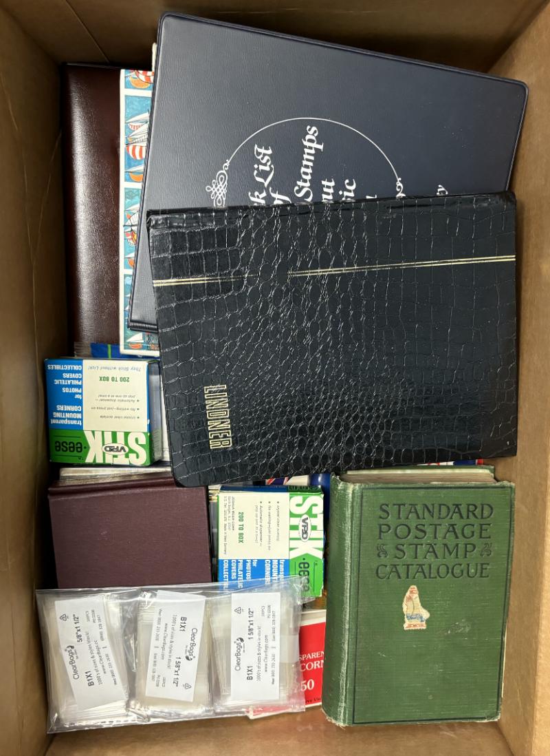Accum over (20) mainly US related reference works mainly 19th Cent & related w/ Skinner & ENO, 1¢ Franklin , AAMC volume I, 1869 Register, 10¢1869 cvrs , USPOs in Japan & China, PA Postal History, Serrane Guide, 30+ packs unopened Showgard strip mounts sizes 50//204, (2) Safe Sign-O-Scopes, 1 Safe Perftronic, all in nice cond w/ original boxes, etc