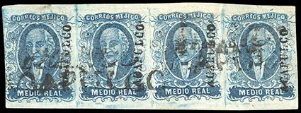 Mexico, Acapulco, 1856, ½r blue. Horizontal strip of 4, straight line Acapulco cancel (Schatzkes 2), wide margins; slight creasing and small margin tear in top right margins, Very Fine (N.F. $360 for singles). Scott No. 1; Estimate $200 - 300. US$200-300 (Image)