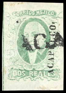 Mexico, Acapulco, 1856, 2r emerald. Showing plate line along outer left margin, straight line Acapulco cancel (Schatzkes 1), large to huge margins, Extremely Fine, only 1,020 issued (NF $200), ex-Chapman. Scott No. 3b; Estimate $200 - 300. US$200-300 (Image)