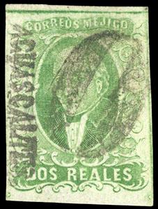 Mexico, Aguascalientes, 1856, 2r yellow green. Showing plate line in top margin. used provisionally in 1864, mute "0" cancel (Schatzkes 12), Very Fine and choice (N.F. $1,200), with 1980 M.E.P.S.I. certificate. Scott No. 3; Estimate $750 - 1,000. US$750-1,000 (Image)