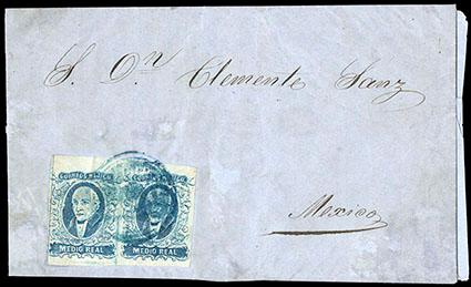 Mexico, Apam, 1856, ½r blue, without district overprint, horizontal pair. Showing plate line at left. Tied by blue negative seal Apam handstamp (Schatzkes 24) on 1859 folded letter from Chimalpa to Mexico, Very Fine,ex-Quast. Scott No. 1b; Estimate $200 - 300. US$200-300 (Image)