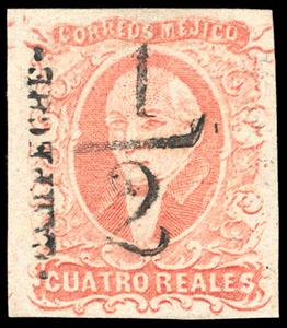 Mexico, Campeche, 1856, 4r red. Central complete strike of "½" cancel (Schatzkes 60), Very Fine and attractive (N.F. $200). Scott No. 4; Estimate $150 - 200. US$150-200 (Image)