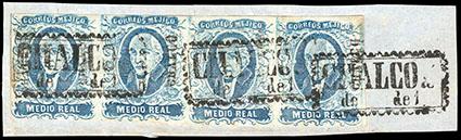Mexico, Chalco, 1856, ½r blue. Horizontal strip of 4, tied on piece by Chalco boxed cancel (Schatzkes 83); minor tone spot at left, still Very Fine. Scott No. 1; Estimate $250 - 350. US$250-350 (Image)