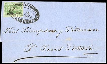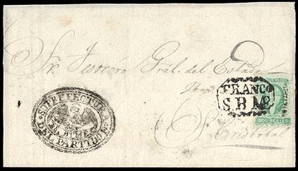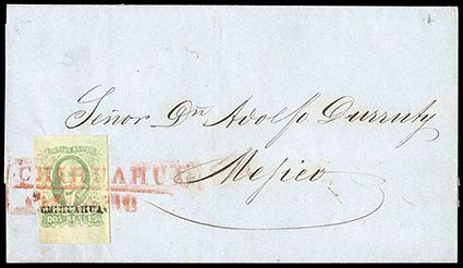 Mexico, Chiapas, 1856, 2r emerald. Wide margins, tied by bold boxed Simojoval handstamp (Schatzkes 118AA) on cover front (with bottom flap) to San Cristobal, oval official eagle cachet handstamp, Very Fine (N.F. $200 for off cover). Scott No. 3b; Estimate $200 - 300. US$200-300 (Image)