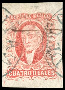 Mexico, Chiapas, 1856, 4r red. Manuscript dash and blue Comitan circular cancels (Schatzkes 115A & 120), huge margins, Extremely Fine (N.F. $600). Scott No. 4; Estimate $500 - 750. US$500-750 (Image)