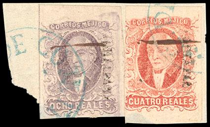 Mexico, Guadalajara, 1856, First Issue, 4r & 8r issues. Group with two 4r singles on piece, 8r and 8r quadrisect on piece, Guadalajara cancels, Very Fine (N.F. $335), quadrisect with 1983 M.E.P.S.I. certificate. Scott No. 4-5; Estimate $150 - 200. US$150-200 (Image)