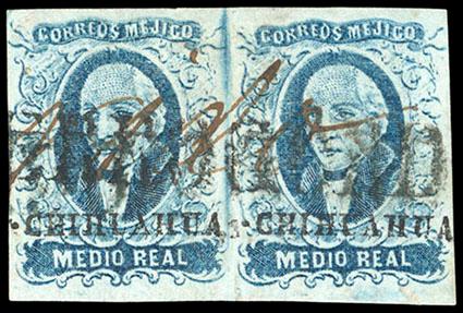Mexico, Chihuahua, 1856, ½r blue. Horizontal pair, manuscript Rio Florido cancel (Schatzkes 166H - 50 points) with additional straight line Cerro Gordo receiving handstamp (Durango, 246AA); crease between stamps, Very Fine,ex-Schenck & Quast. Scott No. 1; Estimate $200 - 300. US$200-300 (Image)