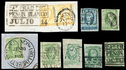 Mexico, 1856, First Issue Stamp Collection Balance. Over 90 stamps arranged by district on stock pages, mostly ½r-2r issues with a few 4r including some bisects on piece; includes Cordova oval (184) on ½r pair, 1r and 2r, Durango with cancels including Gavilanes (254), red San Dimas (251), San Juan del Rio (266), Nazas (273) tying 2r in piece, red Mapimi (269), Papasquiaro (280), 4r bisect on piece, etc., Guadalajara with red boxed Cuale and fancy mute (378A + 377) tying ½r on piece, boxed Tequila (358), etc., Hermosillo with red Guaymas (546) and scarce red boxed Ures (549 - 50/5 points), Huejutla includes Tuxpan oval (578), Jalapa including 4r+1r pair in piece, Oaxaca with Tehuantepec (1070) on 1r & a 4r, Teposcolula (1076), Tlaxiaco (1079), etc., Toluca with Diligencia and Zacatecas with couple 4r bisects and 8r quadrisects on piece, F.-V.F. or better (N.F. $2,337+), with four MEPSI certificates. Scott No. 1//5d; Estimate $1,500 - 2,000.