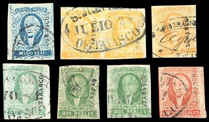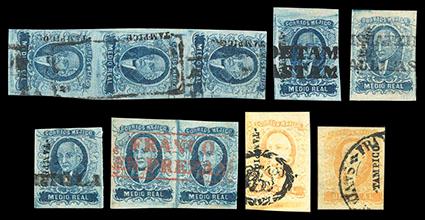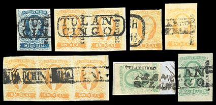 Mexico, Tulancingo, 1856, First Issue, ½r-2r issues. Group with ½r, 1r two singles, pair and strip of 3, 2r two singles; cancels include Tulancingo 1714, 1715, Huauchinango 1722, 1723 - 30 points, Very Fine overall (N.F. $450), 1r strip with 1983 M.E.P.S.I. certificate. Scott No. 1-3; Estimate $200 - 300. US$200-300 (Image)