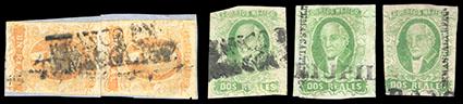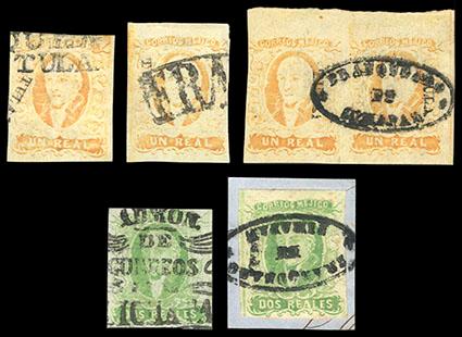 Mexico, Tula, 1856, First Issue, 1r & 2r issues. Group with 1r two singles and pair, 2r two singles; cancels include Tula 1690, 1691, Huichapan 1696 - 100/2 points and Zimpan 1710 - 25 points, Very Fine overall (N.F. $360), one 1r with 1978 M.E.P.S.I. certificate. Scott No. 2-3; Estimate $200 - 300. US$200-300 (Image)