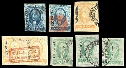 Mexico, Victoria, 1856, First Issue, ½r-2r issues. Group with ½r two singles, 1r single and pair, 2r emerald three singles; cancels include Victoria 1816, Tamaulipas 1839, Jaumave 1830, Very Fine overall (N.F. $545). Scott No. 1-3; Estimate $300 - 400. US$300-400 (Image)