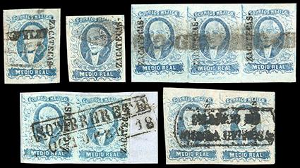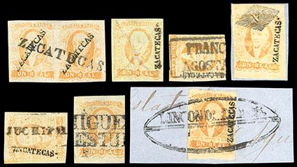 Mexico, Zacatecas, 1856, First Issue, ½r blue. Group of two strips of 4, strip of 3, three pairs and two singles; cancels include Zacatecas 1849, Fresnillo 1867, Aguascalientes 1928 & 1929, Juchipila 1880, Rio Grande 1905, Sombrerete 1913 and Sierra Hermosa 1911, Very Fine overall (N.F. $665). Scott No. 1; Estimate $300 - 400.