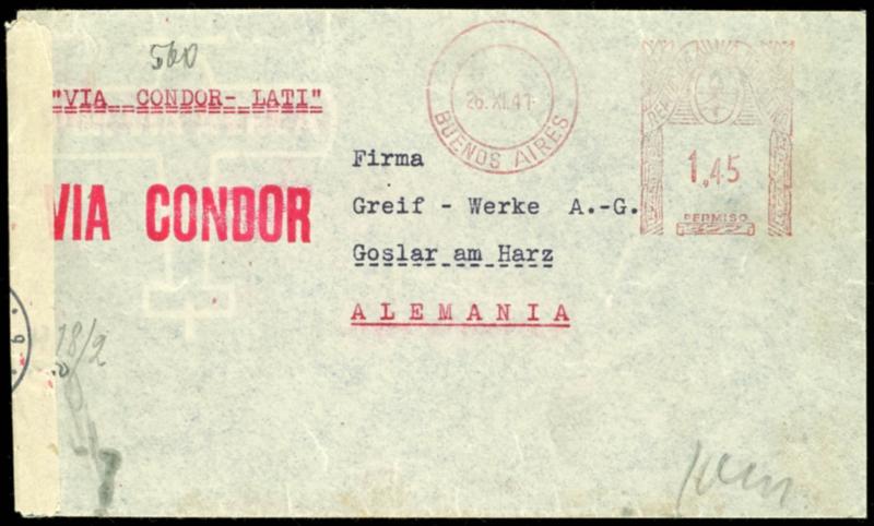 Argentina 1941, air mail letter from Buenos Aires 26.11.41 to the Grasp-works to Goslar, flown with LATI via Italy, the only still open connection with South America, OKW-censorship ARGENTINIEN 1941, Luftpostbrief ab Buenos Aires 26.11.41 an die Greif-Werke nach Goslar, geflogen mit LATI via Italien, die einzige noch offene Verbindung mit Südamerika, OKW-Zensur (Image)
