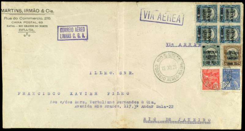 Brazil 1928, large sized airletter from Natal 15.11.28 with 8950 rice, with AÉROPOSTALE to Rio de Janeiro 16.11, reverse coloured vignette \CORREIO AEREO LINHAS C. G. A. \, vertical crease in the middle BRASILIEN 1928, großformatiger Flugbrief ab Natal 15.11.28 mit 8950 Reis, mit AÉROPOSTALE nach Rio de Janeiro 16.11., rs. farbige Vignette \CORREIO AEREO LINHAS C.G.A.\, senkr. Mittelbug (Image)