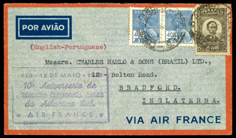Brazil 1940, airmail cover in the second weight category from Sao paulo 11.5.40 to Bradford / England, blue special cancel to the 10 years of existence of the French South Atlantic Line BRASILIEN 1940, Flugpostbrief der 2. Gewichtsstufe ab Sao Paulo 11.5.40 nach Bradford/England, blauer Sonderstempel zum 10 jährigen Bestehen der französischen Südatlantiklinie (Image)