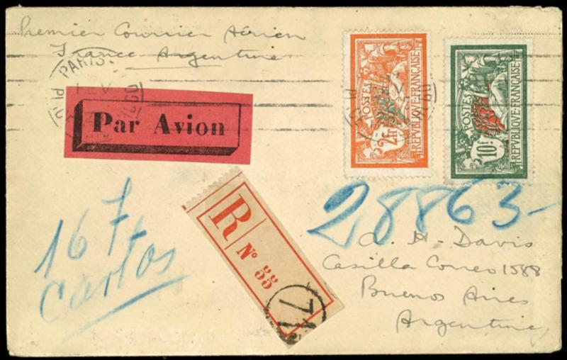 France 1928, 1. flight / Schnellbootverbindung the AÉROPOSTALE from Paris 29.2.28, registered airletter with 12 Fr franking to Buenos Aires 17.3. FRANKREICH 1928, 1. Flug/Schnellbootverbindung der AÉROPOSTALE ab Paris 29.2.28 , R-Flugbrief mit 12 Fr Frankatur nach Buenos Aires 17.3. (Image)