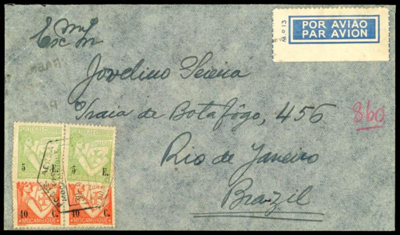mozambique 1938, registered airmail cover from Lourenco Marques 30.4.38 via Marseille and Paris 6.5. with AIR FRANCE to Rio de Janeiro 11.5.38 MOCAMBIQUE 1938, R-Flugpostbrief ab Lourenco Marques 30.4.38 via Marseille und Paris 6.5. mit AIR FRANCE nach Rio de Janeiro 11.5.38 (Image)