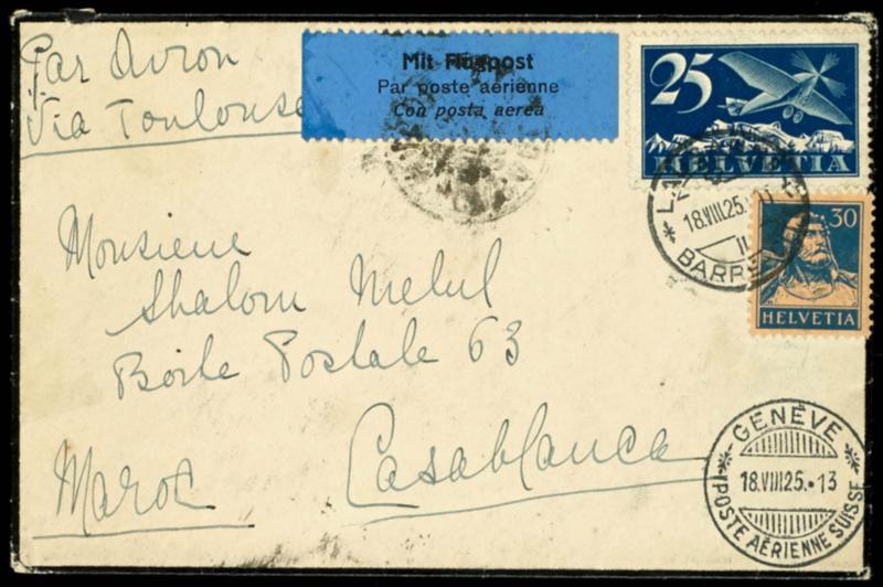Switzerland 1925, airletter from Lausanne 18.8.25 via Geneva 18.8. and Toulouse with LATÉCOERE to Casablanca 20.8. SCHWEIZ 1925, Flugbrief ab Lausanne 18.8.25 via Genf 18.8. und Toulouse mit LATÉCOERE nach Casablanca 20.8. (Image)