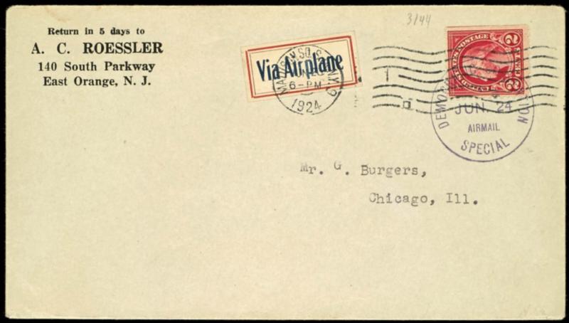 USA 1924, US government special flight to the congress the democrats, air mail letter with flight special cancel \Democratic Convention / Special Airmail\ 24.6.24 with 2 C from Washington to Chicago USA 1924, US-Regierungs-Sonderflug zum Kongress der Demokraten, Luftpostbrief mit Flug-SST \Democratic Convention / Special Airmail\ 24.6.24 mit 2 C ab Washington nach Chicago (Image)