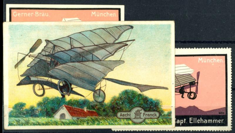 1908, biplane captain Ellehammer, 2 vignettes the Gerner brew, Munich perforated and imperforated, in addition to it image of collection \Aecht Franck\ showing Ellehammers paraglider 1908, Doppeldecker Kapt. Ellehammer, 2 Vignetten der Gerner Brau, München gezähnt und geschnitten, dazu Sammelbild \Aecht Franck\ zeigend Ellehammers Drachenflieger (Image)