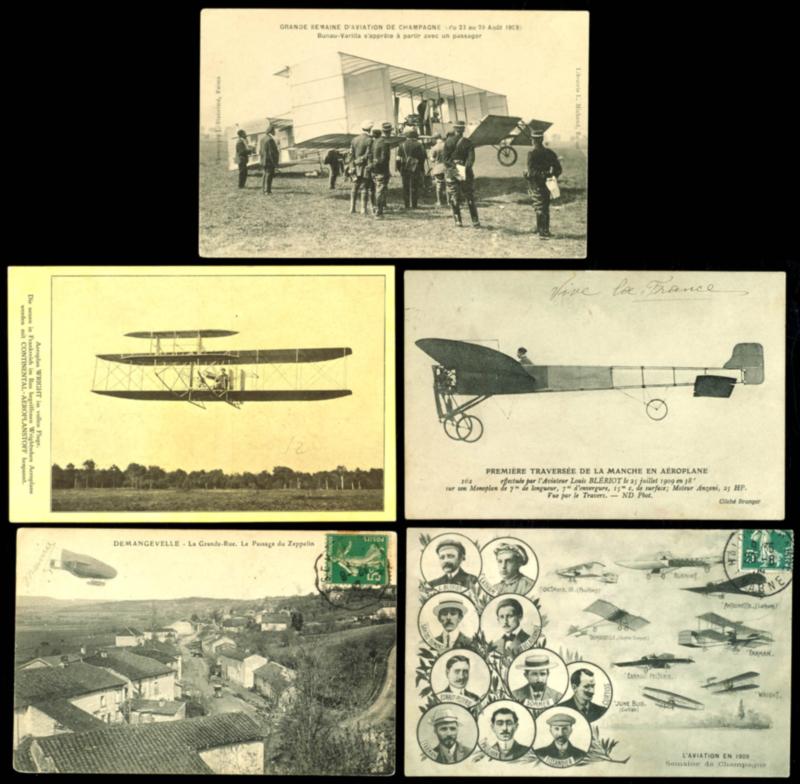 1909, 5 photo cards from France with illustrations from flight machines (4) and a Zeppelin, of it 2 unused 1909, 5 Fotokarten aus Frankreich mit Abbildungen von Flugapparaten (4) und einem Zeppelin, davon 2 ungebraucht (Image)