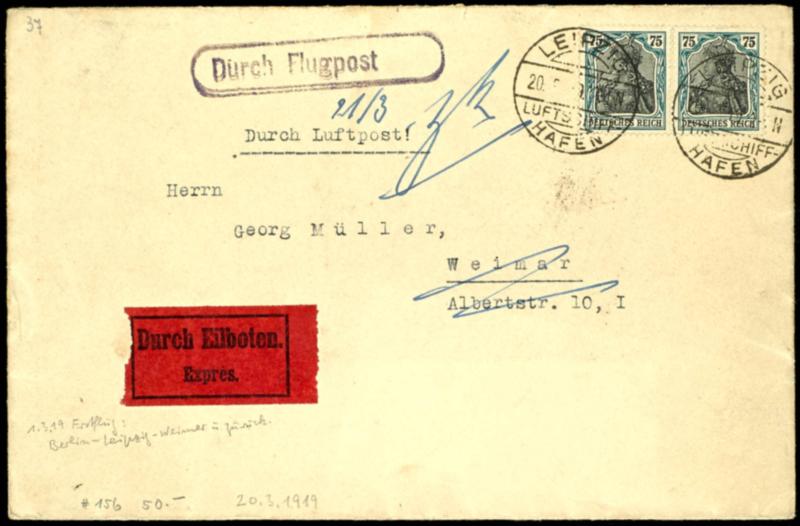 1919, special delivery airletter Leipzig Air ship harbor 20.3.1919 to Weimar 20.3. franked with 2 x 75 Pfg Germania, additional violet \through airmail (19.2 02) 1919, Eilboten-Flugbrief Leipzig-Luftschiffhafen 20.3.1919 nach Weimar 20.3. frankiert mit 2 x 75 Pfg Germania, zusätzlich violetter \Durch Flugpost\ (Image)