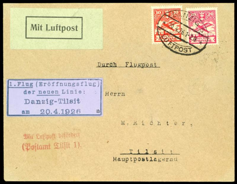 1926, first flight Gdansk - Tilsit, letter from Gdansk 20.4.26 to Tilsit with red m Lb (26.06) 1926, Erstflug Danzig - Tilsit, Brief ab Danzig 20.4.26 nach Tilsit mit rotem mLb (Image)