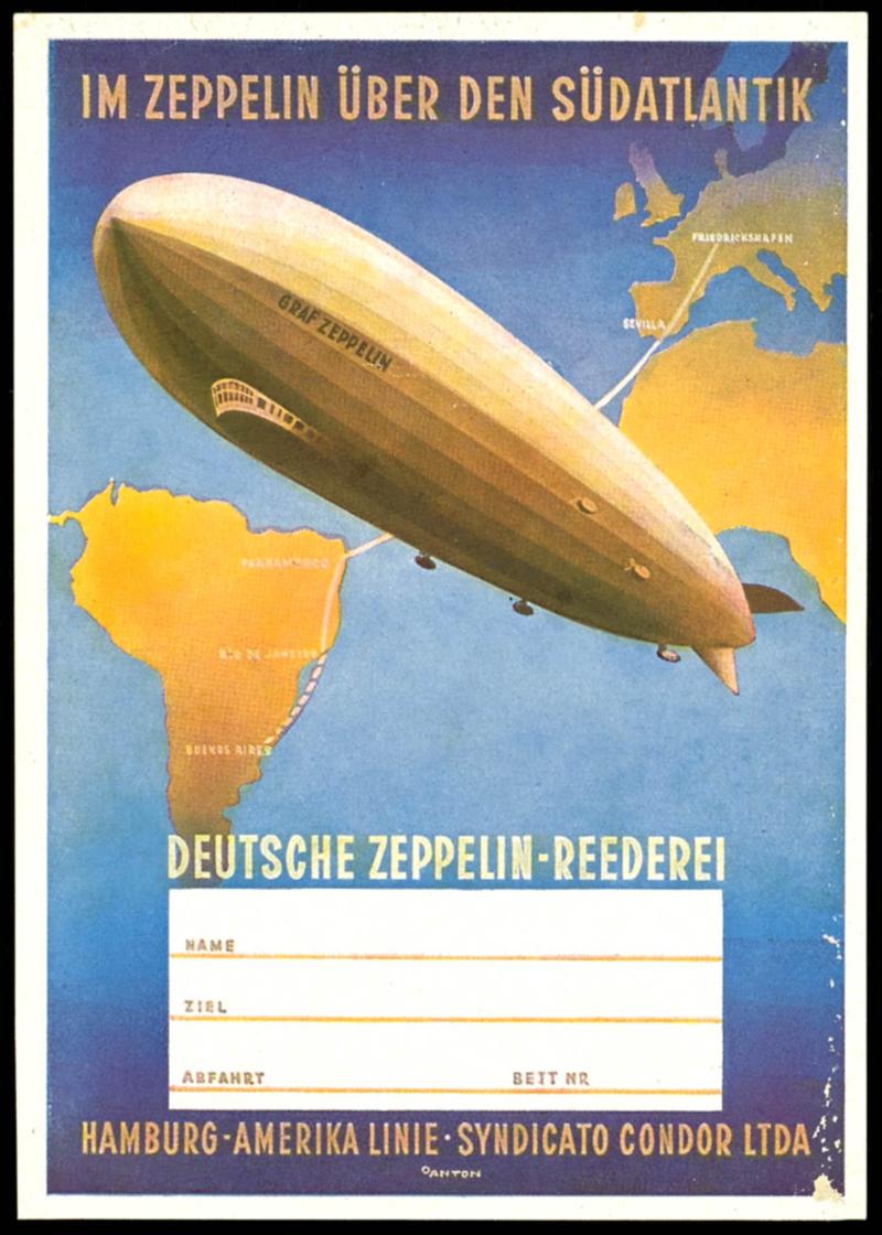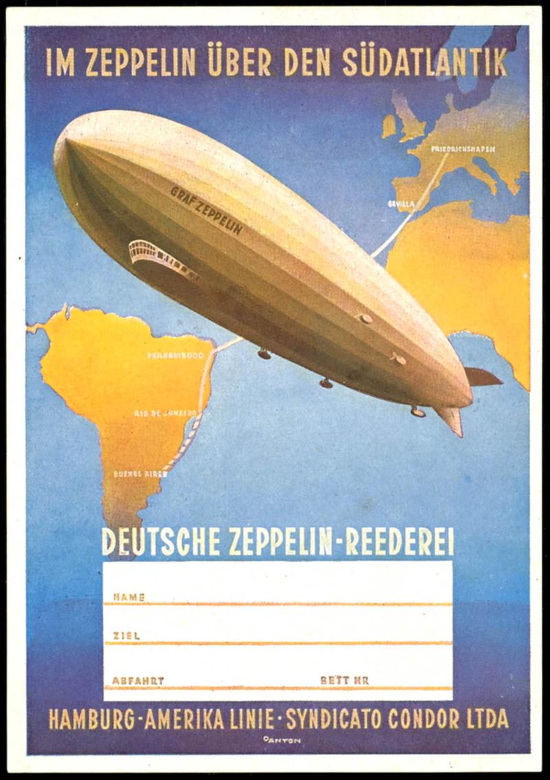 luggage sticker around 1933, four-colour printing on gummed paper, glorious topic \in the Zeppelin over the South Atlantic\ of the German Zeppelin Shipping Company with full original gum with corner hinges, size 105 x 150 mm GEPÄCKAUFKLEBER um 1933, Vierfarbdruck auf gummiertem Papier, prachtvolles Motiv \Im Zeppelin über den Südatlantik\ der Deutschen Zeppelinreederei mit vollem Originalgummi mit Eckfalzen, Format 105 x 150 mm (Image)