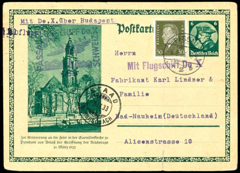 1933, DO-X, flight Passau - Staad, GA Garnisons church with additional franking from Passau 4.9.33 to Staad 5.9. without delay stamp, card at the bottom ripped 1933, DO-X, Flug Passau - Staad, GA-Garnisonskirche mit Zusatzfrankatur ab Passau 4.9.33 nach Staad 5.9. ohne Verzögerungsstempel, Karte unten eingerissen (Image)