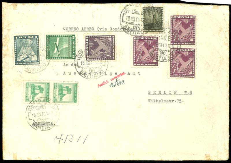 CHILE 1940, 18.6. registered airmail cover of the German Message in Santiago in the 18. weight rate to 90 g, to the out-of-towner office in Berlin, reverse official seal and arrival 29.6, scarce diplomat postal service with airmail postage 200, 20 P, demand and age traces CHILE 1940, 18.6. R-Flugpostbrief der deutschen Botschaft in Santiago in der 18. Gewichtsstufe bis 90 g, an das Auswärtige Amt in Berlin, rs. Dienstsiegel und Ankunft 29.6., seltene Diplomatenpost mit Flugpostporto 200,20 P, Bedarfs- und Altersspuren (Image)