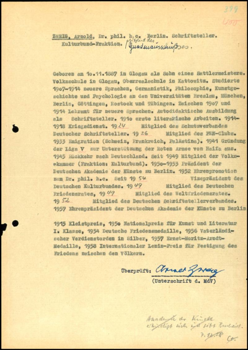branch, ARNOLD, 1887-1969, known German writer and carrier various literature awards, later in of the German Demokratic Republik in leading functions in the Culture, fieldpost letter from 10.8.18 to Berlin to the publisher axel Juncker with a lot of text regarding of a book's and full signature as well with Machine written curriculum vitae with autograph full signatur ZWEIG, ARNOLD, 1887-1969, bekannter deutscher Schriftsteller und Träger diverser Literatur-Auszeichnungen, später in der DDR in führender Funktionen in der Kultur, Feldpostbrief vom 10.8.18 nach Berlin an den Verleger Axel Juncker mit viel Text bezüglich eines Buches und voller Signatur sowie mit Maschine geschriebener Lebenslauf mit eigenhändiger voller Unterschrift (Image)