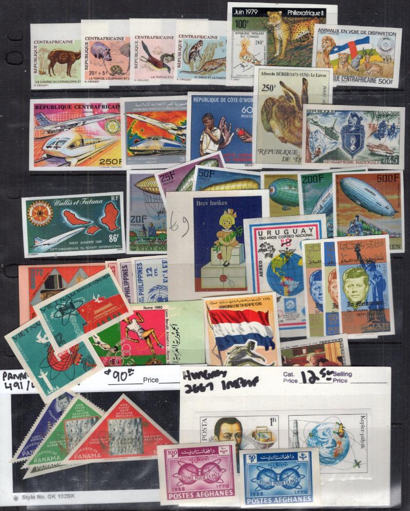 IMPERFORATE Accum abt (500) Unused Imperforates 20th Cent in abt (80+) dealer & 102 cards & glassines; some incl both perf & imperf varieties; incl sgls, sets, short sets, S/S; owner's CV $2,500 (NV); gen F-VF NH (Image)