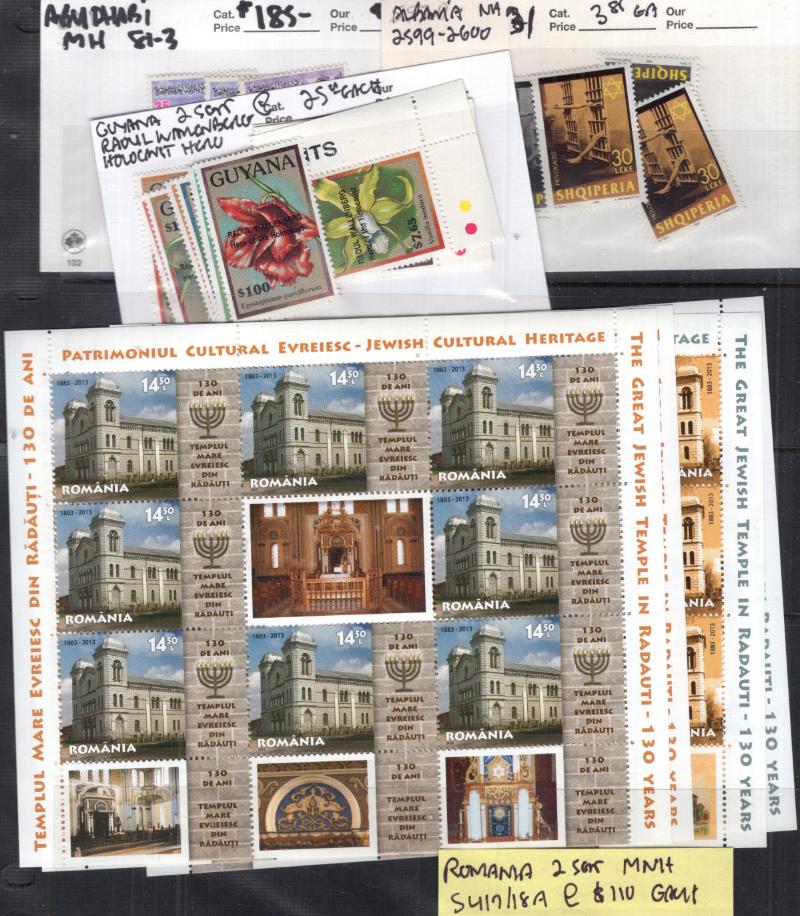 JUDIACA Accum abt (1000+) topicals incl sgls, sets & short sets on abt (100+) dealer & 102 cards & glassines in a box, also abt (100+) S/S, mini sheets, souv pgs, FD souv cards & more; Unused incl Abu Dhabi #81-83, Guyana w/ Raoul Wallenberg Ovpts, Romania 5417a (2), 5418a (2) & much more; owner's CV $2,000 (NV); gen F-VF NH (Image)