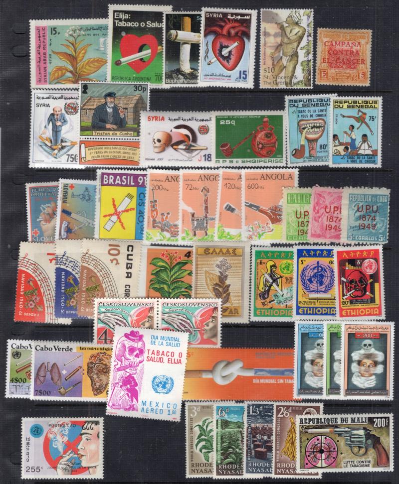 TOBACCO Accum (100s) Unused 20th Cent in abt (50+) dealer & 102 cards; topics incl tobacco growing, smoking, anti-smoking, cancer & more; incl sgls, sets, short sets, mini-sheets & a few FD souvenir cards; some light dup; owner's CV $1,000 (NV); gen F-VF NH (Image)