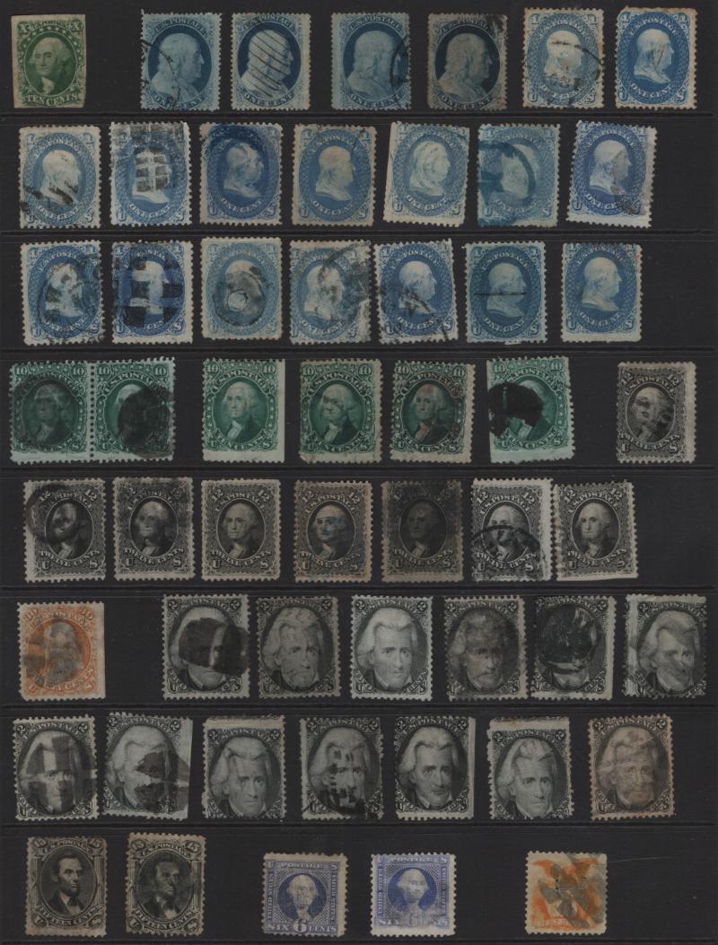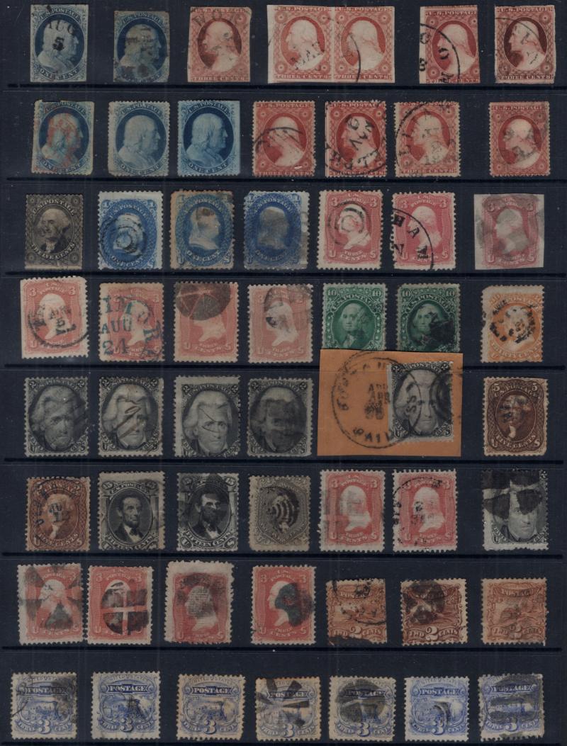 Accum Used over (600) 19th Cent in (16) page stkbk incl pgs of #10/11s, 25/26s, 65s, plus 68s, some Bknts, 3¢ rose grills, saw owner IDed #24 w/ "STEAM/SHIP" hs, 10A w/ U.S. EXPRESS MAIL" cds cancel, few color cancels, many fancy cancels-stars numbers, targets, geometrics & cds town cancels; not checked by us for grills, varieties or recutting; cond varies, Avg to VF, faults to most sound (Image)
