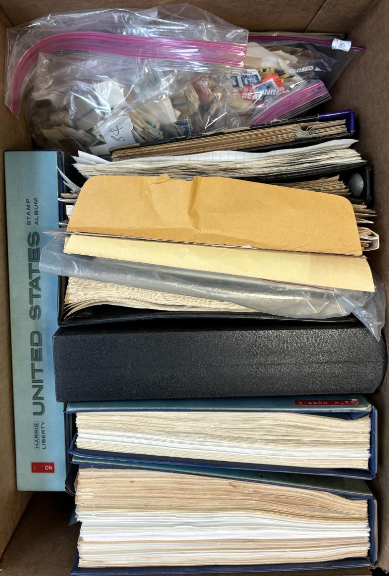 Estate Balance Lot incl loose album pgs 1930-60s defins & commems, several early NG Ducks, some minor flts, C18 unused w/ glazed gum, #696 hinged graded 85, CE2 NH graded 90, child's used collection, some USPS souvenir pgs (many are trimmed), old Scott catalogs (1897, 1901, 1914), more; gen F-VF (Proceeds benefit autism charity in Mass.)