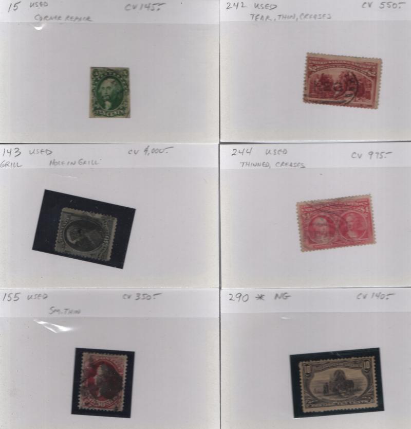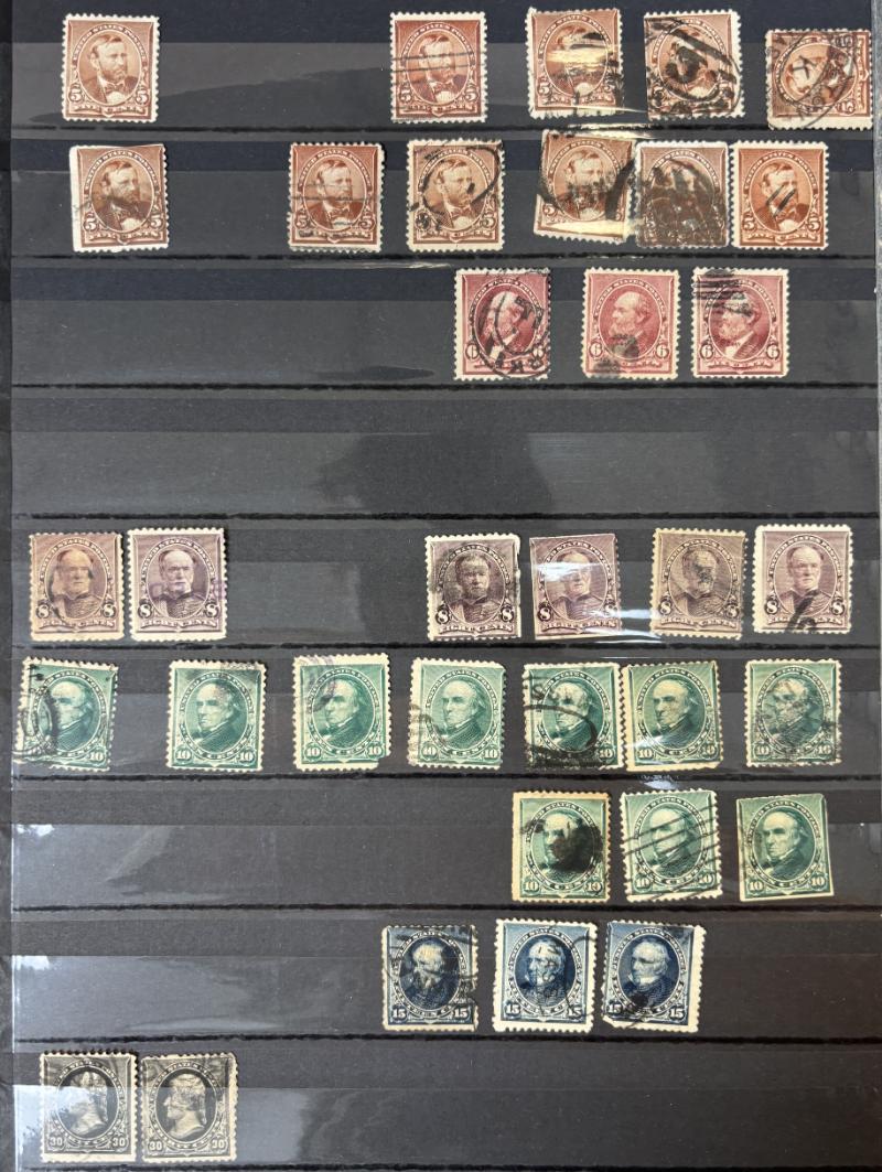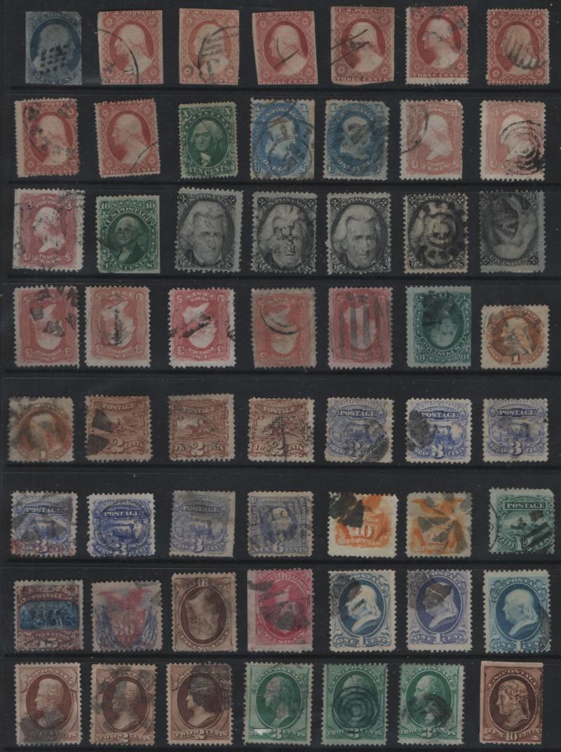 Accum Used over (700) 19th Cent in (2) small stkbks; classics, grills, 1869s to 3¢, Bknts to 15¢, Bureaus to $1, Columbians to 50¢, some fancy & color cancels; owner's CV over $11,000 (NV); reasonable dup; cond varies, flts to much sound, Avg-VF, gen Fine to F-VF (Image)