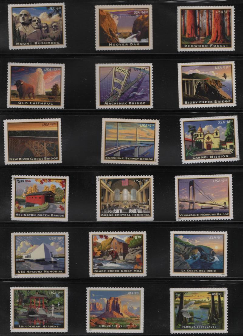 American Landmarks Issues unused NH, (18) diff priority/express rates ($4.80 to $19.99), #4268//5751; all self adhesive; face $184.59, owner's 2025 CV $406 (NV), VF NH (Image)