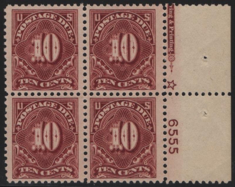 J65b VF NH, Block, 10¢ deep claret, 3mm spacing, right margin Blk w/ pl# 6555, part imprint & star (Image)