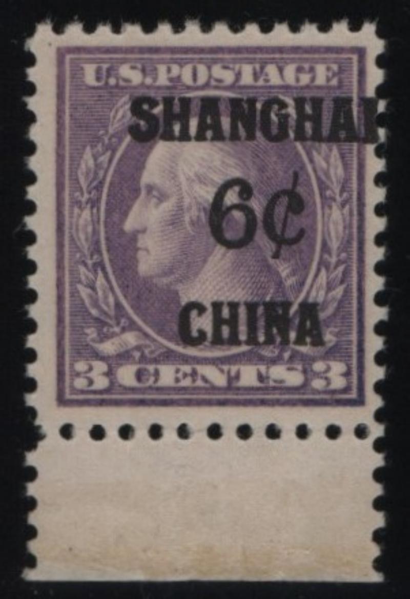 K3 VF NH, 6¢ on 3¢ violet, Shaghai Ovpt, w/ bottom margin (Image)