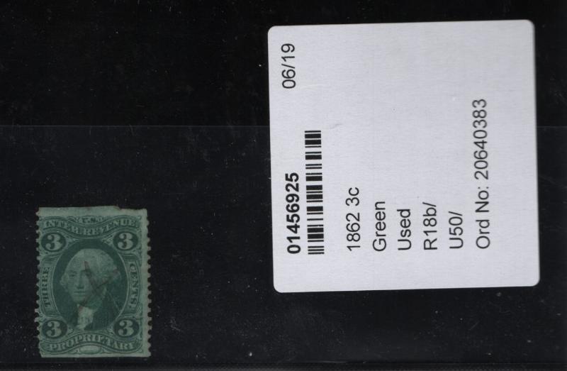 R18b F+ 3¢ green Proprietary, couple shorter perfs, scarce item, rich color, pen cancel, 2025 PSE Cert (Image)
