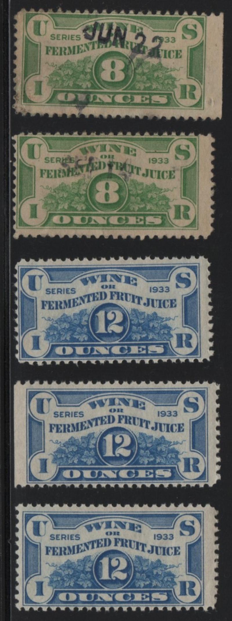 REF3-REF4 F-VF Fermented Fruit Juice 8 oz light green (2) used, wrinkles; and 12 oz light blue (3) all unused NH; one of each w/ SE (Image)