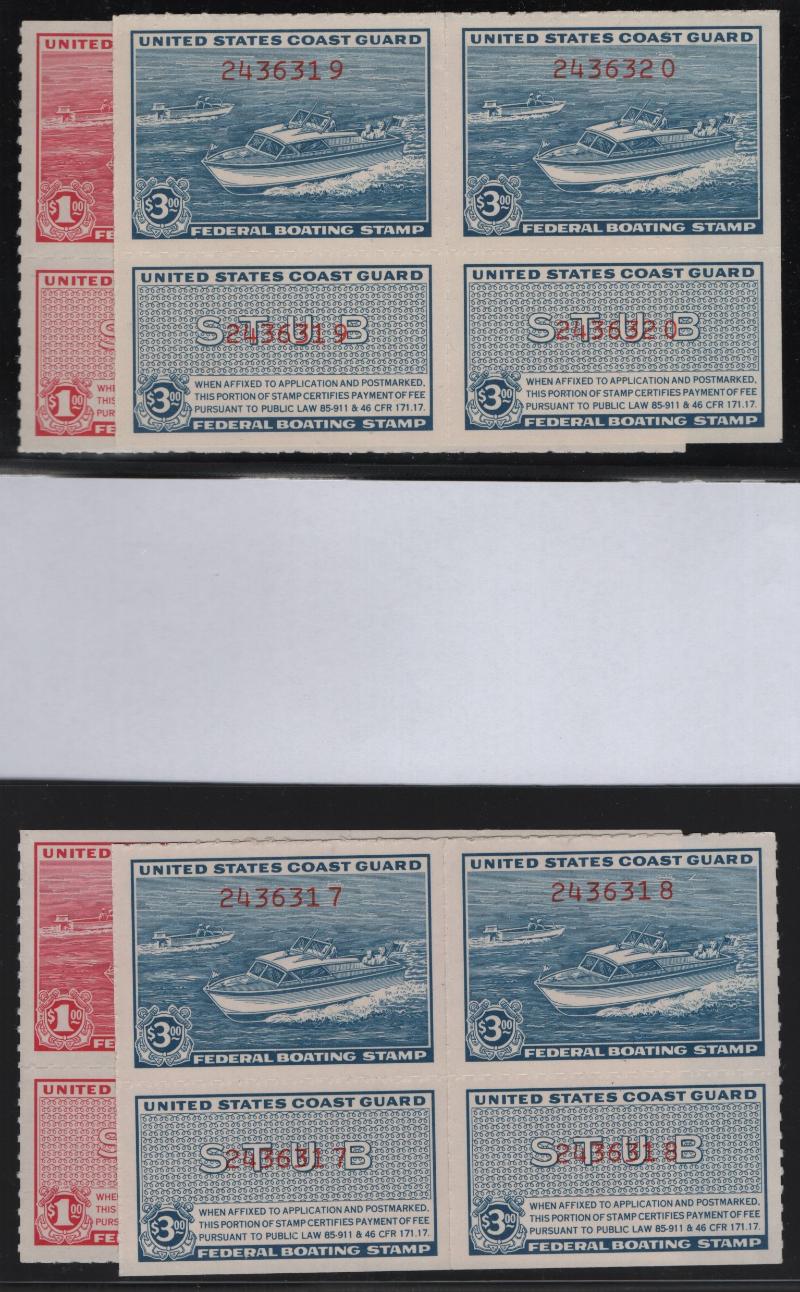RVB1, RVB2 (4) VF NH, (4 of each two part stamps), $1 rose red & $3 blue boating stamps (Image)