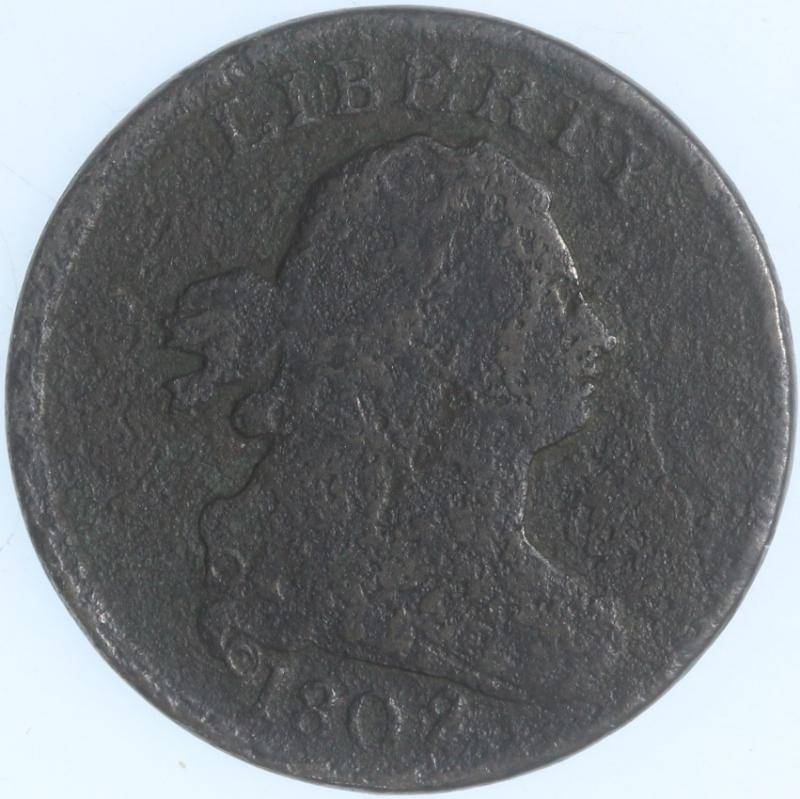 1802 over 0 Rev of '02 (C2) Fine Detail but w/ some moderate to heavy corrosion, however date and legends are clear and identification is easy. In MEGA RED, Bowers notes that " . . . . the half cents of 1802 were struck on poor planchets and when seen today are apt to be porous and rough, . . . . most from cut down large cent mis-strikes. Rare in any grade . . . . . the highest graded is an XF." Though considered "Not Suitable for Encapsulation" (NGC now charges an additional fee to encapsulate corroded coins), the label does indicate that it is Genuine. (Image)