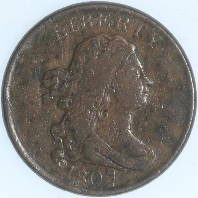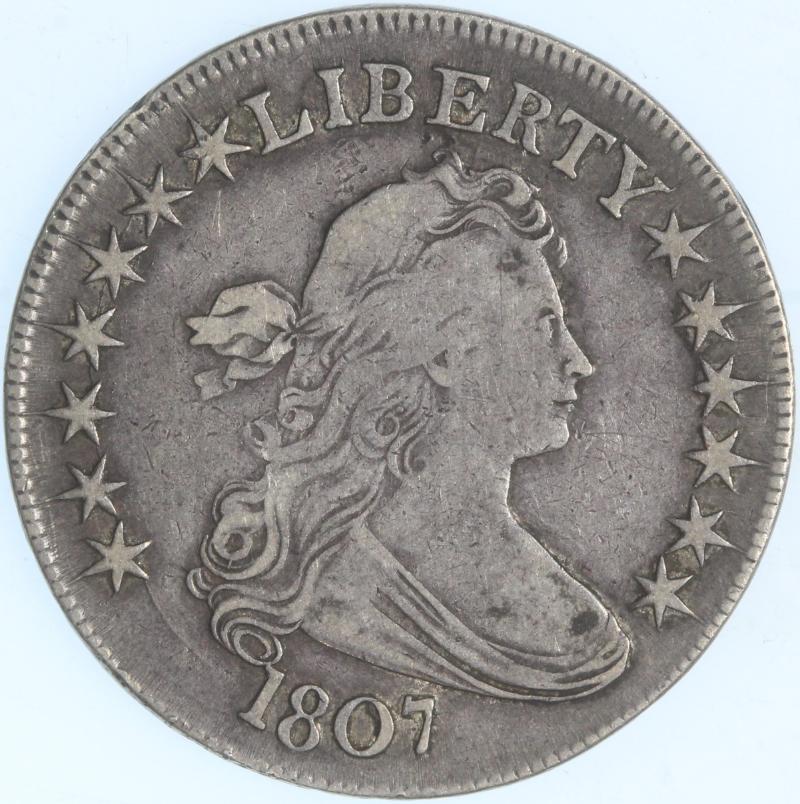 1807 Draped Bust O-105a F+ perhaps better on the rev. Beautiful original grey. (Image)