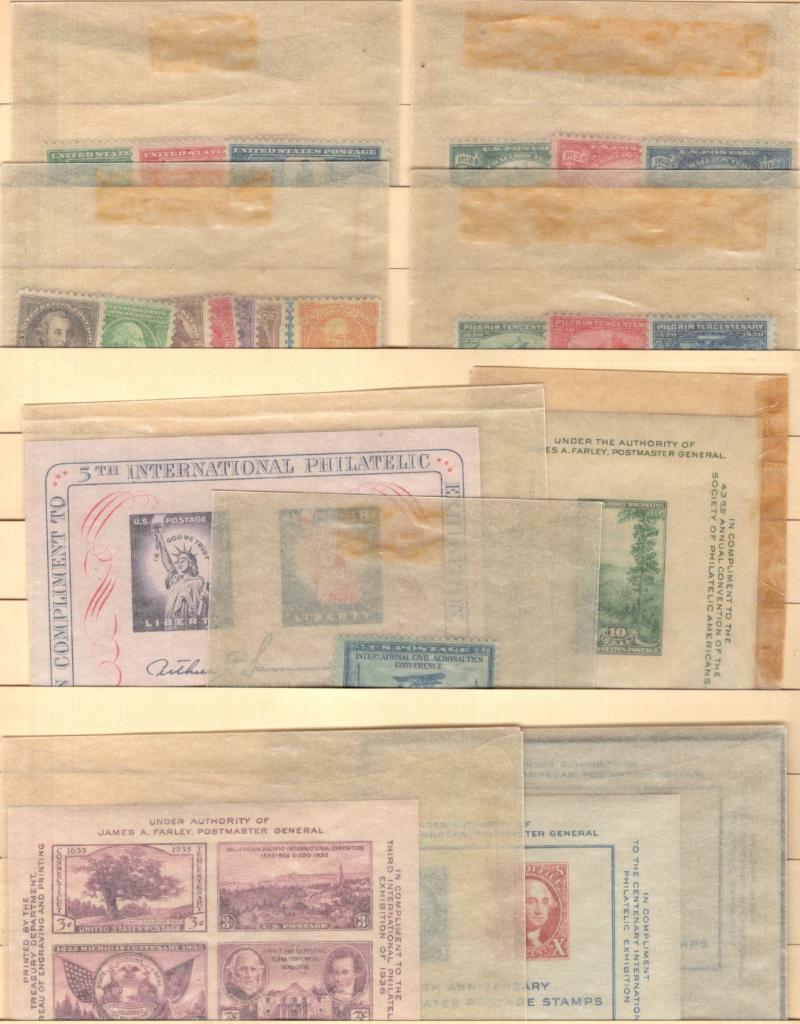 Collection (100s) Unused 20th Cent mounted on W/A pgs in (4) binders incl #601-06 pairs, 658-60, 667, 669-71, 730-31, 750-51, a few Farley gutter pairs, 803-33, 1030-52 & more, appears cplt 1940-80, abt (100+) 5¢, 6¢, 8¢ & airmail PBKs in glassines, also abt (100) cacheted UA FDC 1960s-80s & more; some moderate dup in PBKs, FV abt $280; gen F-VF H/NH (Image)