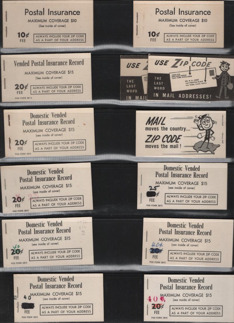 INSURANCE VENDING BOOKLETS Collection, group (28), 1965-80s, 10¢ to 50¢ rates incl (2) QI-1, hs & ms revalued for 20¢, 40¢, 45¢ & 50¢ rates & (1) 60¢ "error"; not often offered; plus vending machine insurance catalog; gen F-VF to VF (Image)